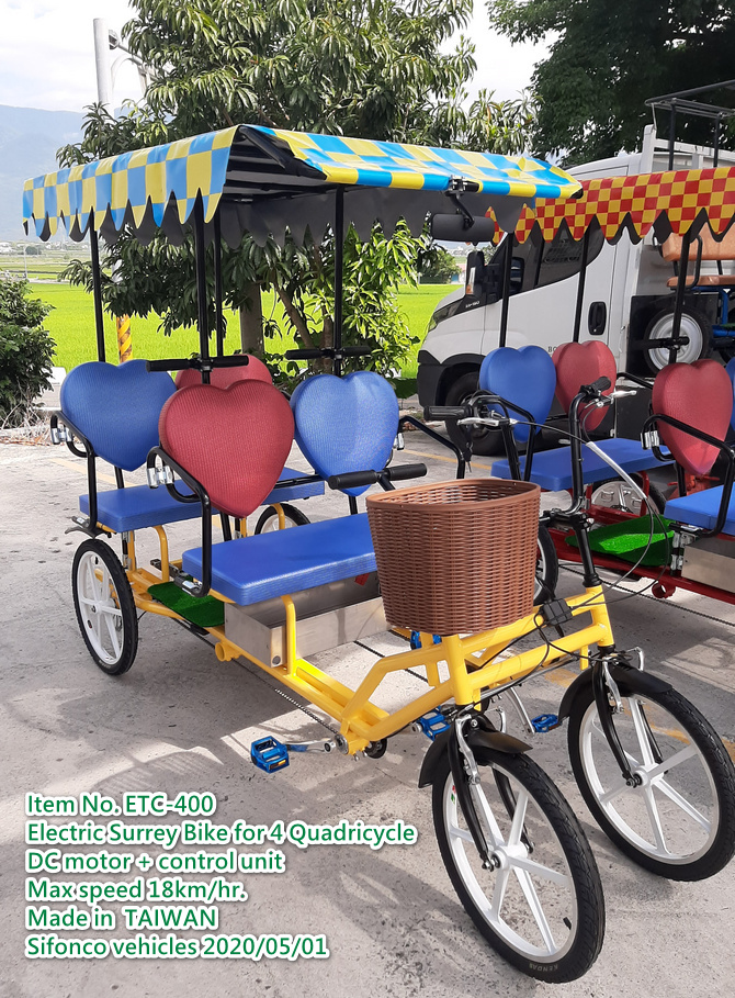 With the base of quad wheels bicycle, we install a motor, a LFP battery, a control system. So here comes a “Quadricycle electric surrey bicycle”.